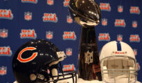Feb 2, 2007; Miami Beach, FL, USA; The Chicago Bears and Indianapolis Colts helmets sit beside the Lombardi Trophy during the head coaches press conference for Super Bowl XLI at the Miami Beach Convention Center More...