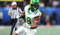 ATLANTA, GEORGIA – JANUARY 09: Kenyon Sadiq #18 of the Oregon Ducks runs with the ball against the Indiana Hoosiers during the first quarter of the 2025 College Football Playoff Semifinal at the Chick-fil-A More...